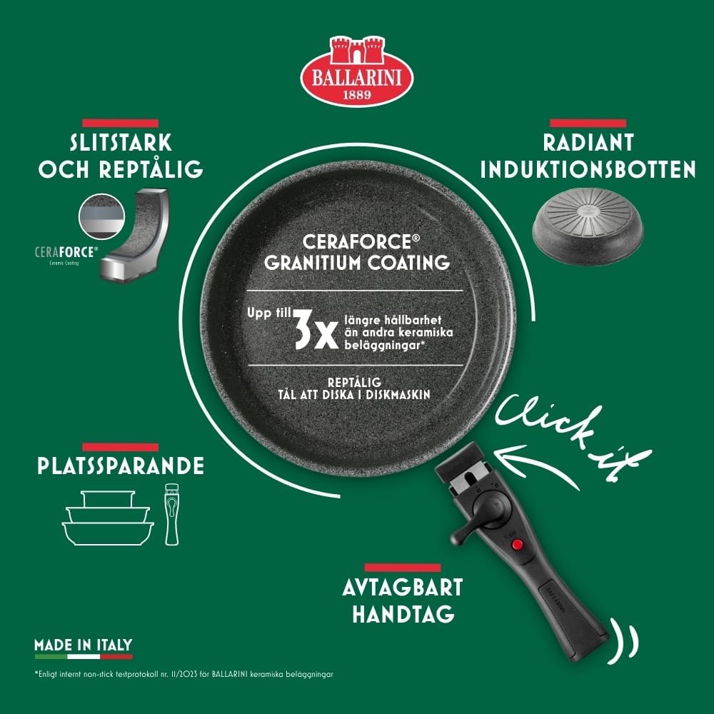 Sağlıklı pişirme: Yenilikçi CERAFORCE Granitium seramik kaplama az yağlı kızartma sağlar ve sağlıklı bir yaşam tarzını destekler. Ayrıca kaplama önceki seramik kaplamalarımızdan üç kata kadar daha dayanıklıdır* (*BALLARINI seramik kaplamalar için dahili yapışmaz test protokolü No. 11/2023) ve PFAS olmadan üretilmiştir – kaygısız keyif için.