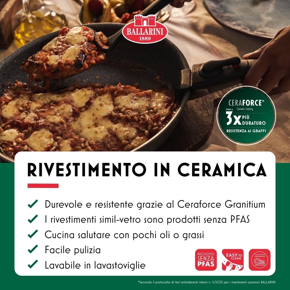 Sağlıklı pişirme: Yenilikçi CERAFORCE Granitium seramik kaplama az yağlı kızartma sağlar ve sağlıklı bir yaşam tarzını destekler. Ayrıca kaplama önceki seramik kaplamalarımızdan üç kata kadar daha dayanıklıdır* (*BALLARINI seramik kaplamalar için dahili yapışmaz test protokolü No. 11/2023) ve PFAS olmadan üretilmiştir – kaygısız keyif için.
