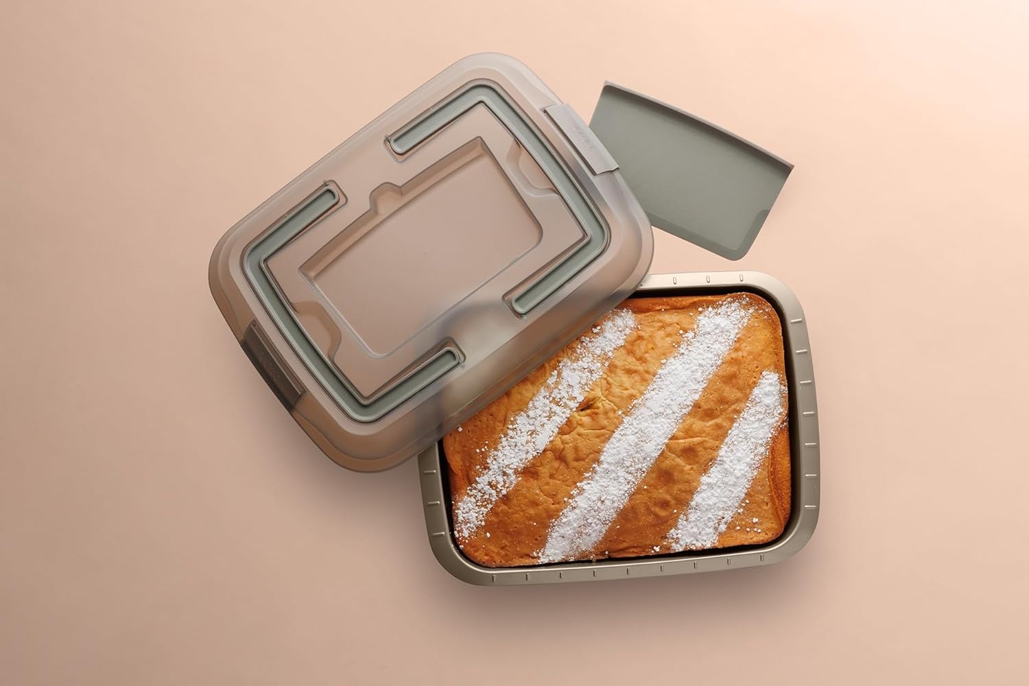 Parkta piknik yapmak istiyorsunuz? Katlanabilir sapları ve kesme aleti olan bu kek kalıbı yanınıza almak için uygundur. Kek kalıbı, yapışmaz kaplamalı karbon çeliğinden yapılmıştır ve porsiyonlama için ızgara çizgilerine sahiptir.