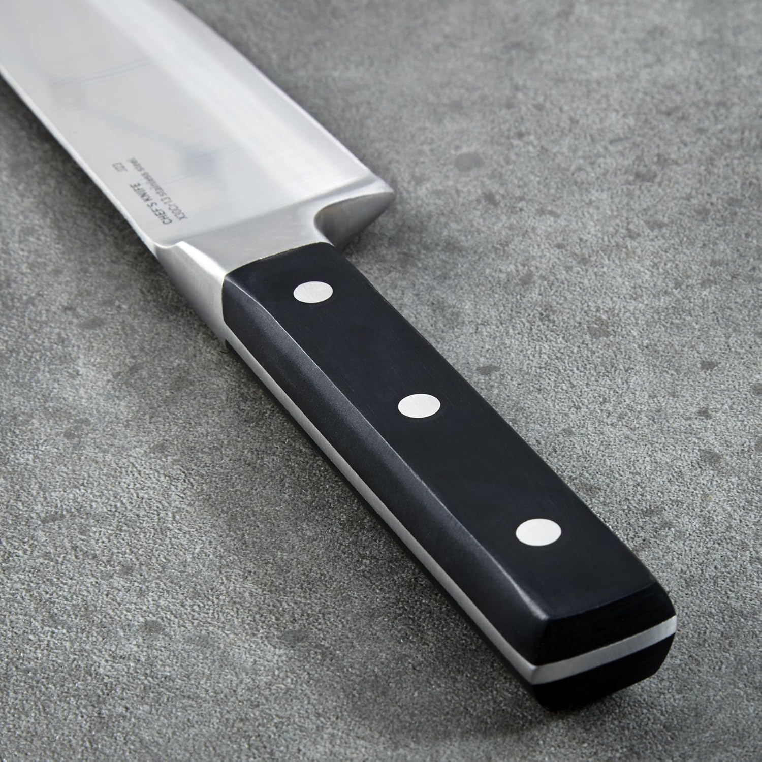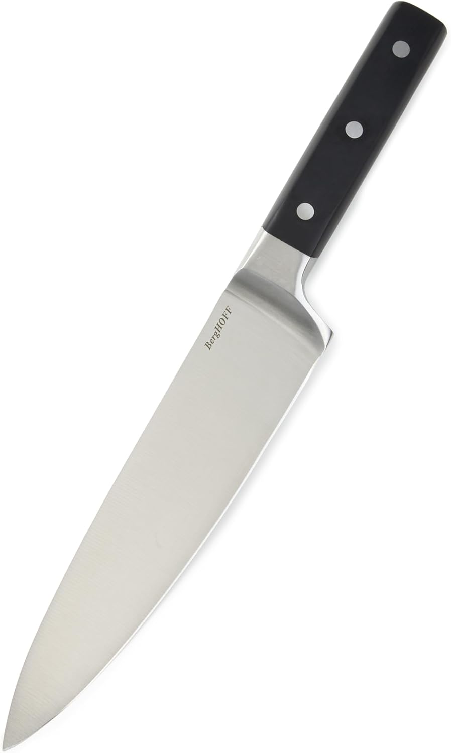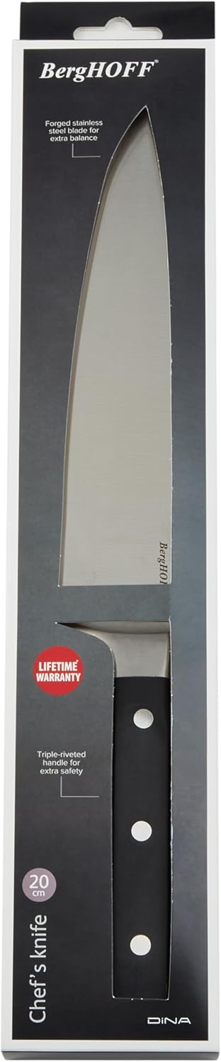 Berghoff şef bıçağı farklı uzunluklarda sunulmaktadır. Dövülmüş paslanmaz çelik bıçak ve yukarı doğru kavisli uca sahiptir. Üç perçinli sapı bulunmaktadır. Gövde malzemesi 18/10 paslanmaz çelik, kulp malzemesi üç perçinli ABS içermektedir. Elde yıkanması önerilmektedir.