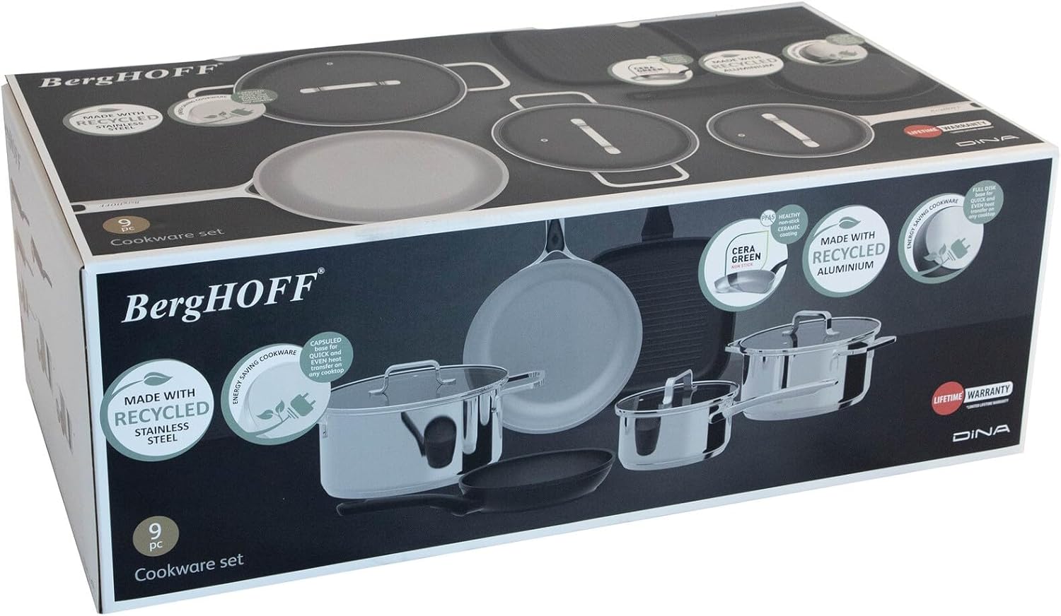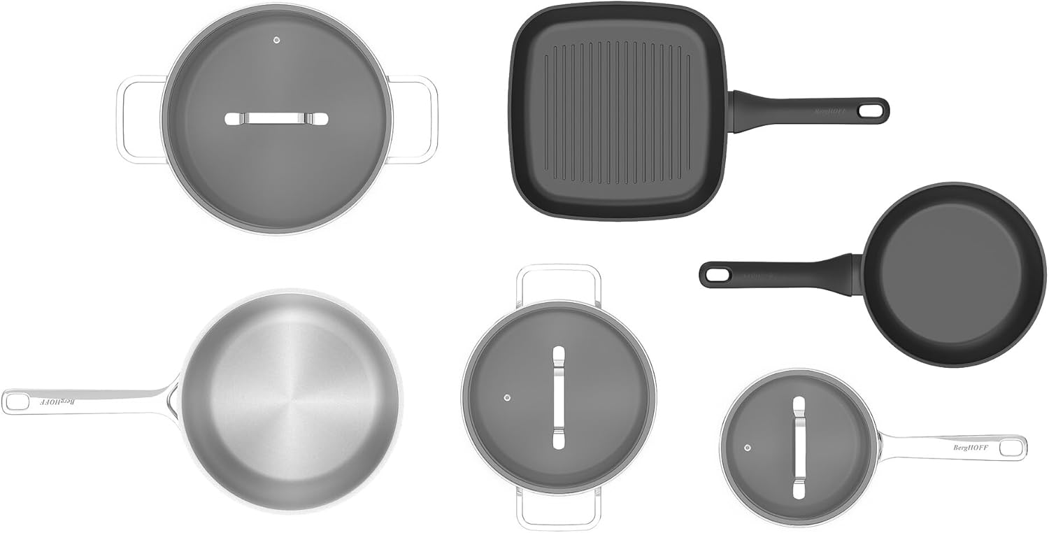 Bu set, geri dönüştürülmüş paslanmaz çelik ve kaplanmış geri dönüştürülmüş alüminyumdan yapılmış tencere ve tavaların bir karışımından oluşur. Tencere, 20 cm ve 24 cm çapında, ve 24 cm kızartma tavası, geri dönüştürülmüş paslanmaz çelikten yapılmıştır. Kapsül taban, indüksiyon dahil her tür ocakta ısıyı tüm yüzeye dağıtır. Tencerenin ve pişirme kaplarının şeffaf cam kapakları paslanmaz çelik bir kenara ve buhar valfine sahiptir. Bu ürünler bulaşık makinesinde yıkanabilir. 20 cm yapışmaz kızartma tavası ve 24 cm yapışmaz ızgara tavası geri dönüştürülmüş alüminyumdan yapılmıştır ve CeraGreen kaplamaya sahiptir. Bu tavalar bulaşık makinesinde yıkanamaz.