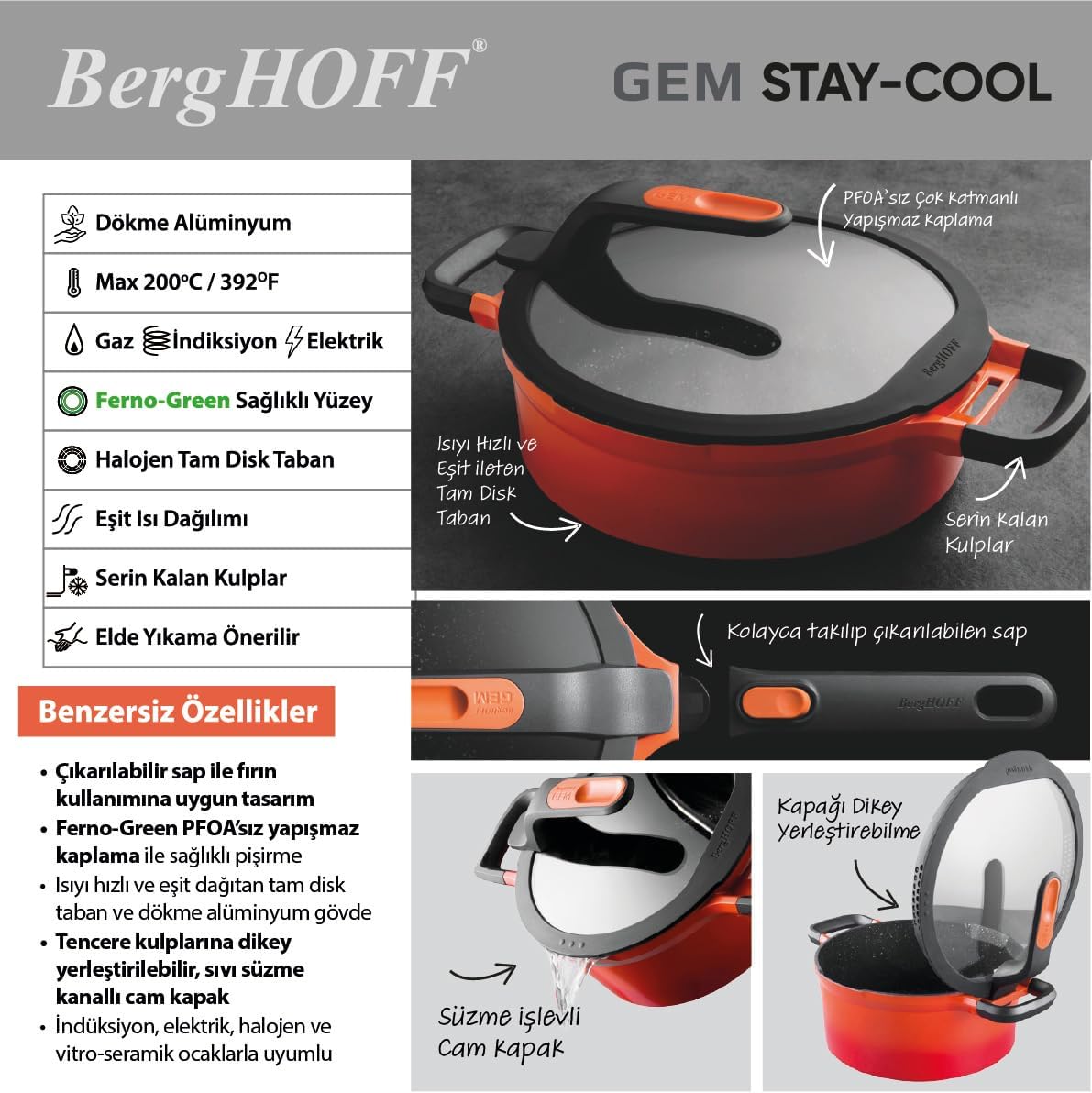 Isınmayan tutma kolları sayesinde kullanım kolaylığı sağlar, İndüksiyon dahil tüm ocak tiplerinde kullanıma uygundur