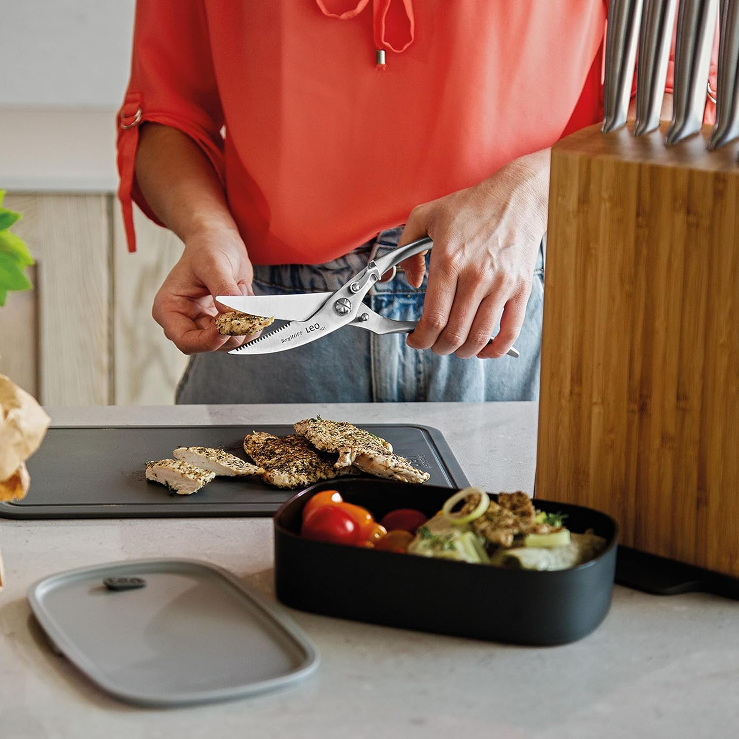 Bu kanatlı makasları, paslanmaz çelik bıçaklı 11 parçalı bıçak bloğuna mükemmel bir ektir. Kümes hayvanlarını porsiyonlar halinde kesmek, sicim kesmek, yengeçleri kesmek gibi çeşitli mutfak işleri için harika bir araçtır. Makasların şık, içi boş sapları rahat bir tutuş sağlarken, paslanmaz çelik bıçak ağızları hassas eti yırtmadan kemikleri keserek uzun süreli keskinlik sağlar ve bakımı kolaydır. ÖNE ÇIKAN ÖZELLİKLER Kavisli, konik bıçaklar erişilmesi zor alanlara ulaşır Çok fonksiyonlu kesme Ekstra hijyen için tek parça yapı Güvenli ve rahat tutuş için ergonomik sap Yüksek kaliteli 18/10 paslanmaz çelik Temizlemesi kolay