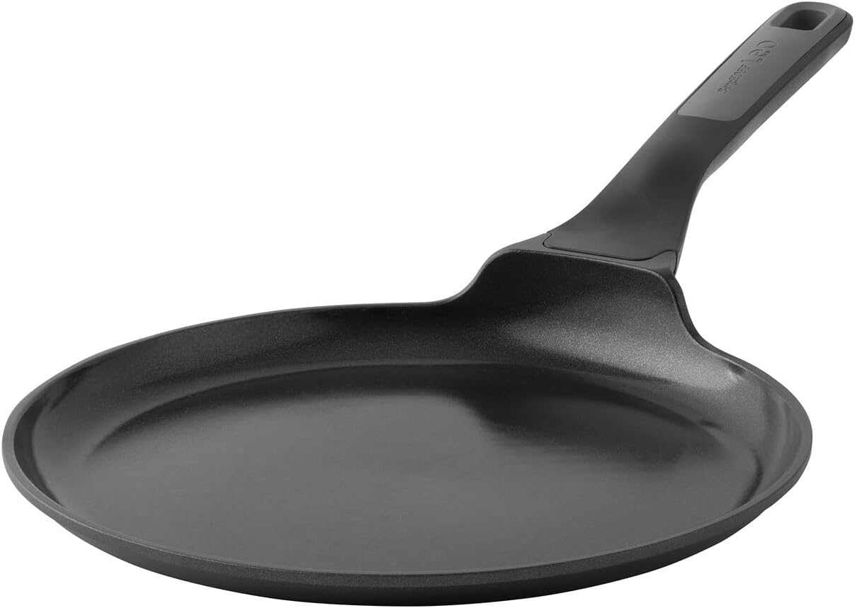 Yaban mersinli pankek veya Fransız krepi yapmak için kullanılan bu geri dönüştürülmüş alüminyum döküm krep tavası, indüksiyon ve downdraft egzoz sistemleri dahil tüm ocaklarda kullanılabilir. 180 derece sıcaklığa kadar fırında kullanılabilir. Disk tabanı ısı dağıtır. Seramik CeraGreen yapışmaz kaplamaya sahiptir. Silikon uçlu tutma yeri vardır. Gövde malzemesi geri dönüştürülmüş alüminyum döküm, kulp malzemesi fenolik reçinedir. Elde yıkanması önerilir.