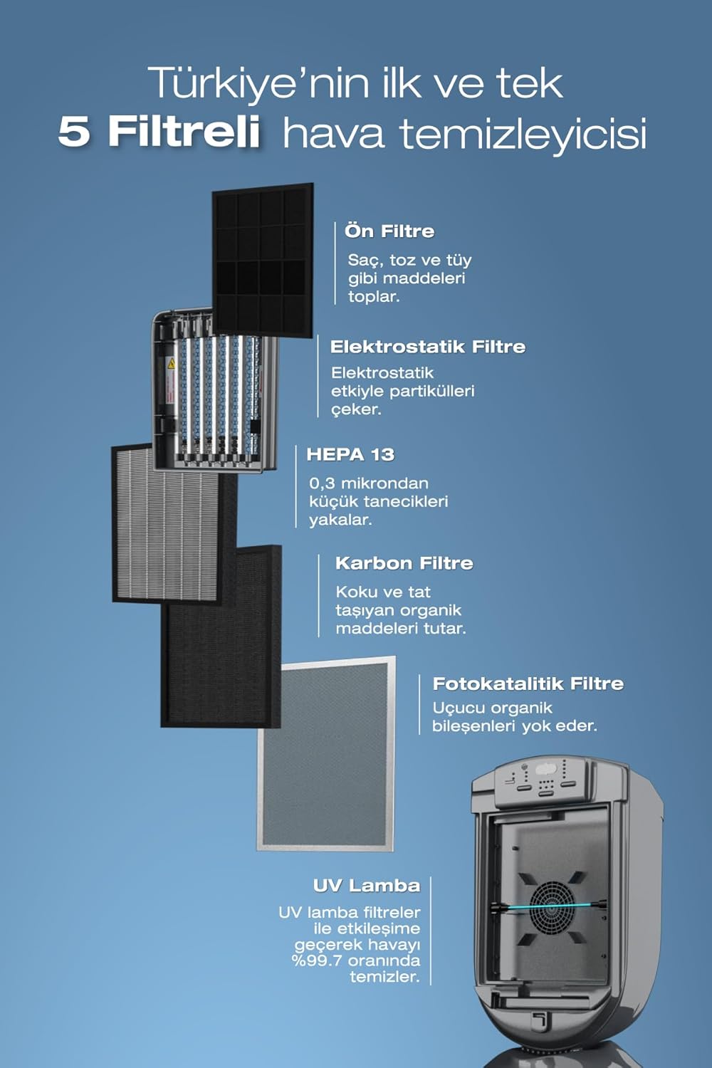5 katmanlı gelişmiş filtreleme sistemi ile havadaki zararlı partikülleri etkili şekilde temizler