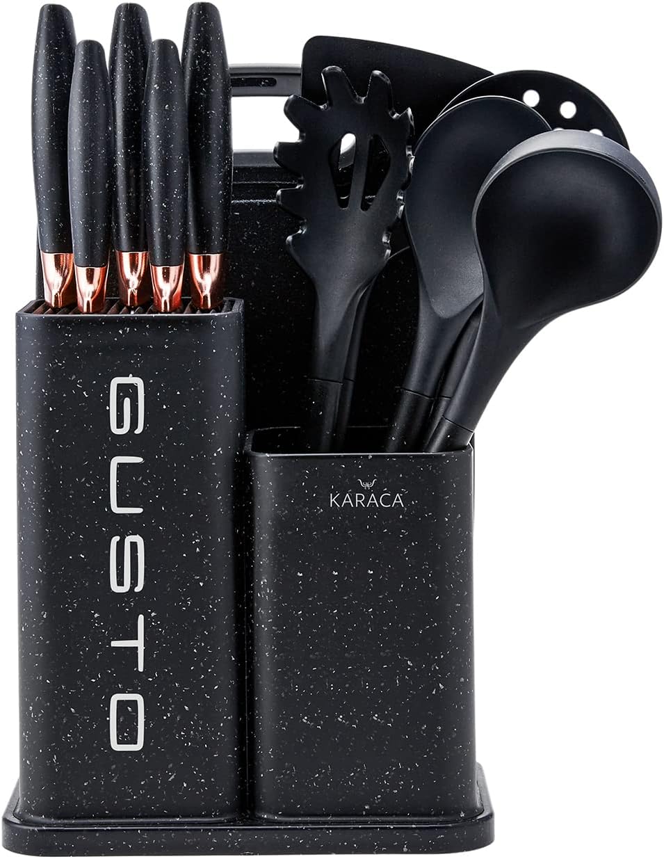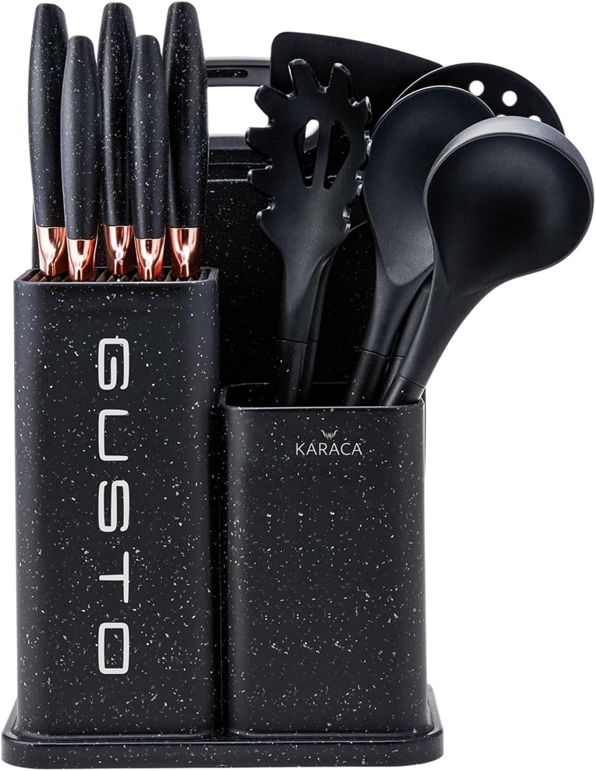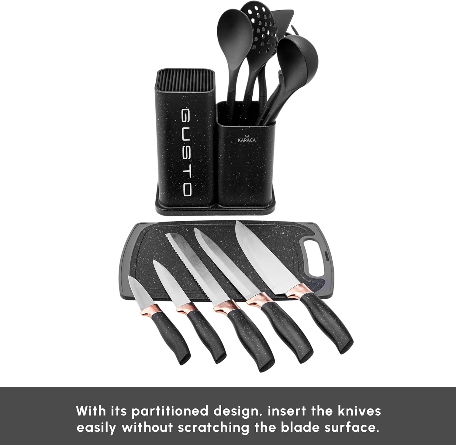 Profesyonel şefler için keskin ve dayanıklı yardımcı: Karaca Gusto 12 parça bıçak ve kesme tahtası seti, mutfağınızda ve sofranızda tarzınızı yansıtır. Set, 12 farklı parçalık bıçak, ergonomik servis gereçleri, özel stand ve dayanıklı kesme tahtası içerir.