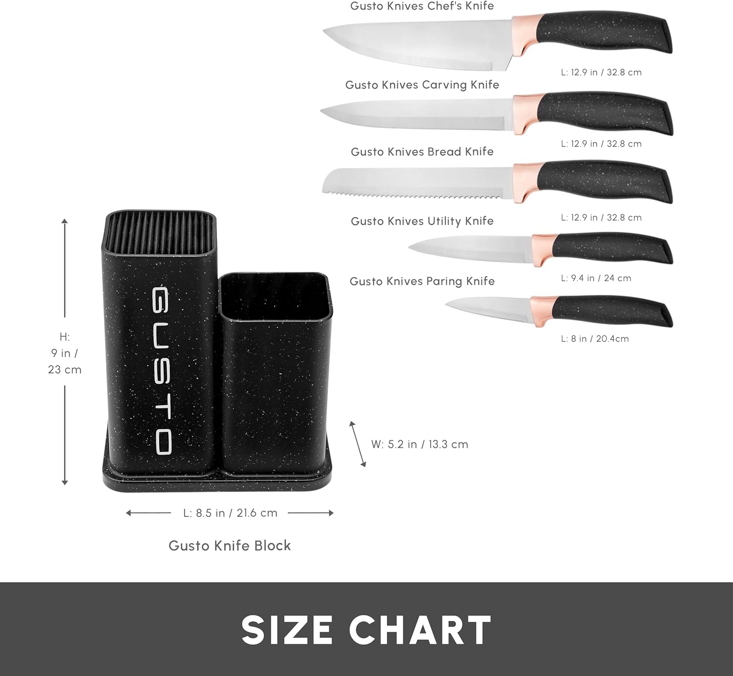 Keskin ve dayanıklı bıçaklar: Set, çeşitli boyutlarda dilimleme, şef, ekmek, doğrama ve soyma bıçağı içerir. Her bıçak, oldukça keskin ve dayanıklıdır.