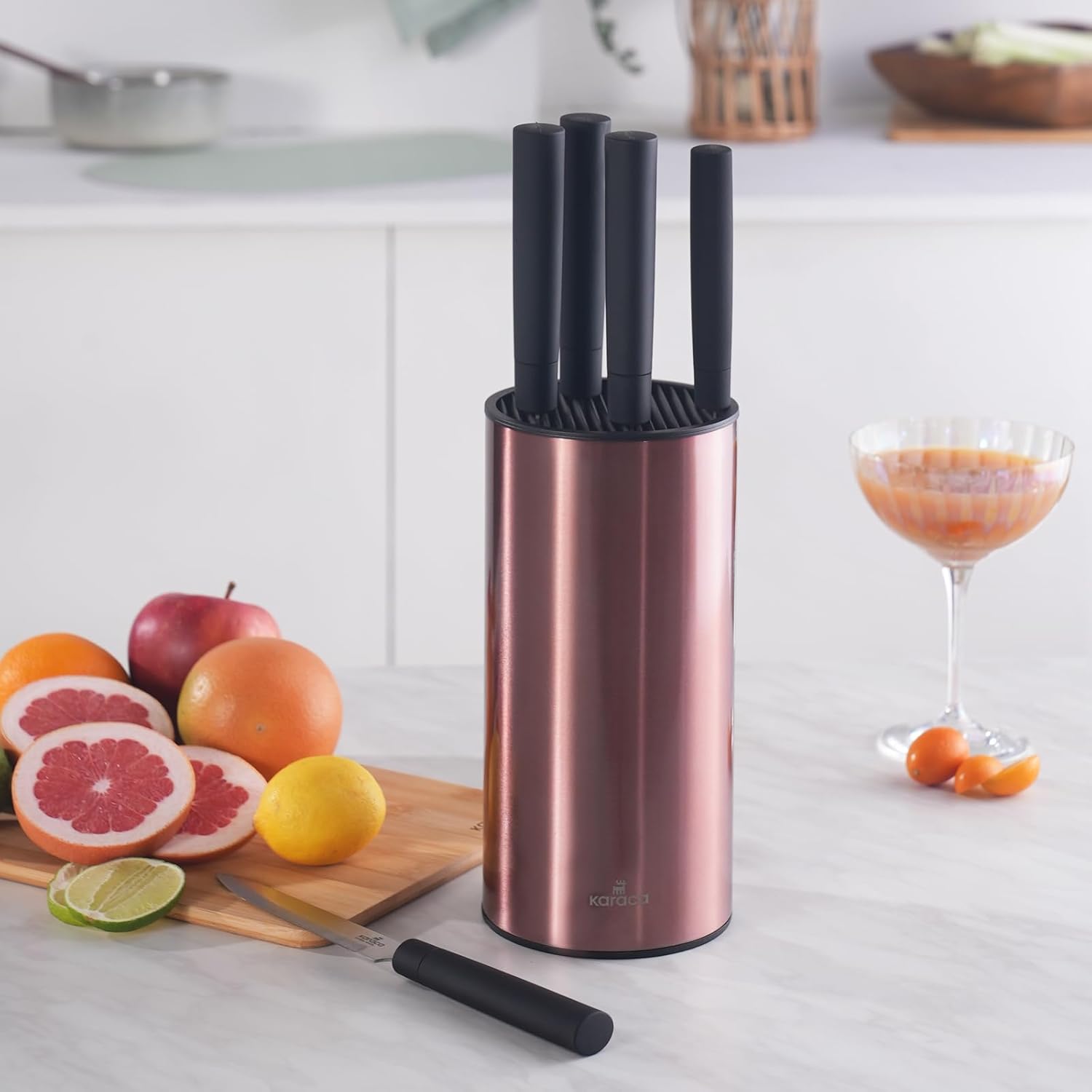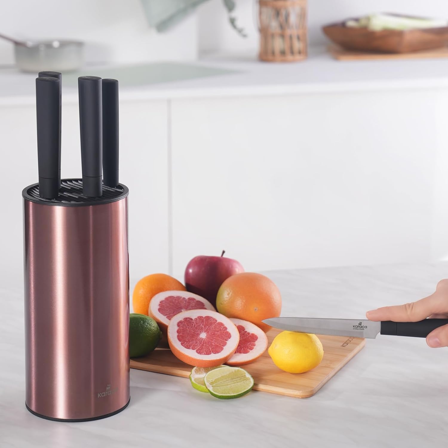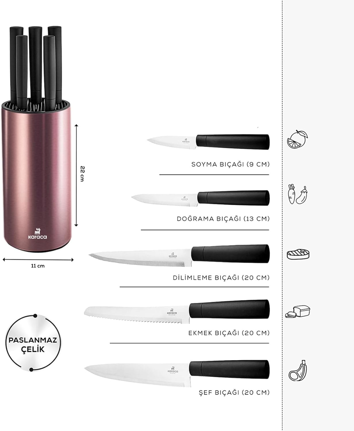 Karaca Oscar Rose 6 Parça Standlı Bıçak Seti, mutfağınız için profesyonel bir çözüm sunar. Paslanmaz çelik malzemeden üretilen bıçaklar uzun ömürlü kullanım ve üstün dayanıklılık sağlar. Set içerisinde bulunan 6 farklı bıçak, tüm kesme ihtiyaçlarınıza cevap verir. Şık tasarımlı stand ile mutfağınızda düzenli ve estetik bir görünüm elde edersiniz. Ergonomik tutma sapları sayesinde güvenli ve konforlu kullanım sunar.