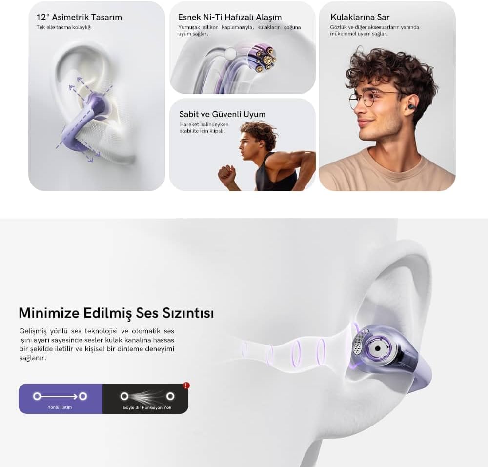 C şeklinde açık kulak tasarımıyla QCY Crossky C30, kulak kanalını kapatmadan çevrenizle senkronize olmanızı sağlar10,8 mm çift mıknatıslı sürücü ünitesiyle kulaklıklar, kompakt gövde içinde yüksek ses kalitesi ve net vokaller sunar. Gelişmiş yönlü ses teknolojisi ve otomatik ses ışını ayarlaması ile sesler kulak kanalına iletilirDinamik EQ algoritması bas performansını düzenler ve yüksek frekanslı sesi dengeler. Her ses seviyesinde dengeli ses sunar