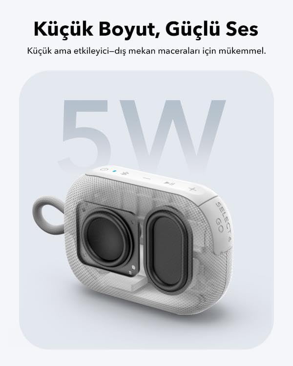 Soundcore by Anker, Select 4 Go, 20 Saat Ultra oynatma süresi, 5W Güçlü Ses, IP67 Tam Koruma ve Yüzerlik, Hafiflik ve kayış tasarım, Her yere taşıması kolay, Kablosuz Stereo Eşleştirme (TWS), Beyaz
