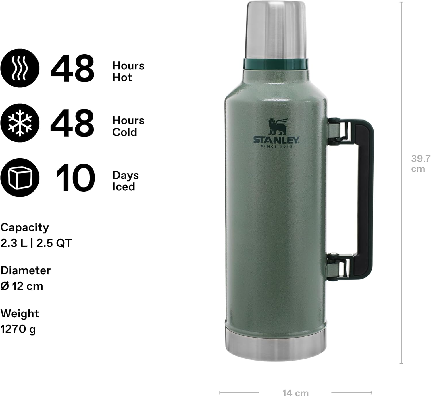 Stanley Classic Legendary Vakumlu Çelik Termos, Yeşil (Hammertone Green), 2.3 Litre