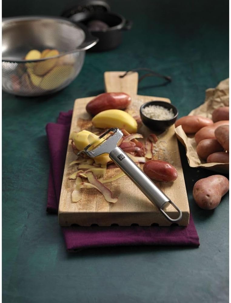 ZWILLING Pro sarkaç soyacağı ile esnek çift bıçak sayesinde kolayca soyulabilirsiniz. Ergonomik sap konfor sağlar, minimalist tasarımı onu mutfağınızda öne çıkarır.